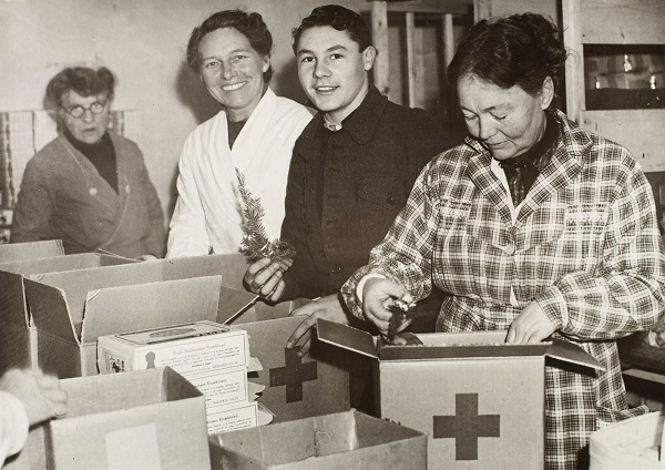 Датские представители Красного Креста пакуют посылки для заключенных Терезиенштадта