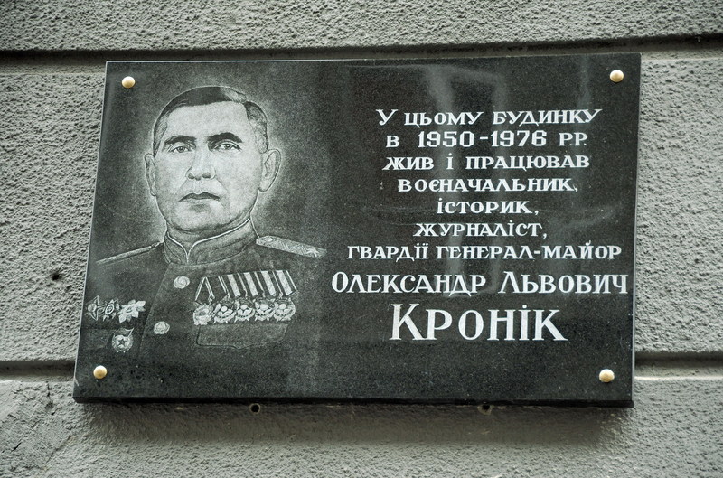 Характерна история с мемориальной доской на доме генерала-еврея Александра Кроника, установленной в 2011 году на Крещатике, 15 по инициативе журналиста Дмитрия Червинского и при ходатайстве Государственной пограничной службы Украины и Всеукраинского союза участников войны. 25 мая 2016 года доска была демонтирована, правда, через месяц стараниями того же Червинского возвращена обратно. При этом еще в ноябре 2015 года в письме в КГГА председатель Украинского института национальной памяти Владимир Вятрович отмечал, что доска Кронику демонтажу не подлежит. Перестарались, бывает… Другие «перестаравшиеся» в сентябре 2016-го, прямо перед 75-й годовщиной трагедии Бабьего Яра, намалевали на доске слово «Кат». Вандалы, разумеется, так и остались неизвестными.