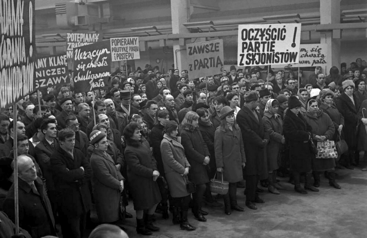19 марта на крупном партийном митинге Гомулка предложил, чтобы евреи, которым Израиль дороже Польши, «рано или поздно покинули нашу страну».  Сам генсек, будучи женат на еврейке, не питал антисемитских предрассудков, но слишком велик был соблазн направить народный гнев в нужное русло. В массы пошла гулять невеселая шутка: «В чем разница между нынешним и довоенным антисемитизмом? — До войны он не был обязательным».