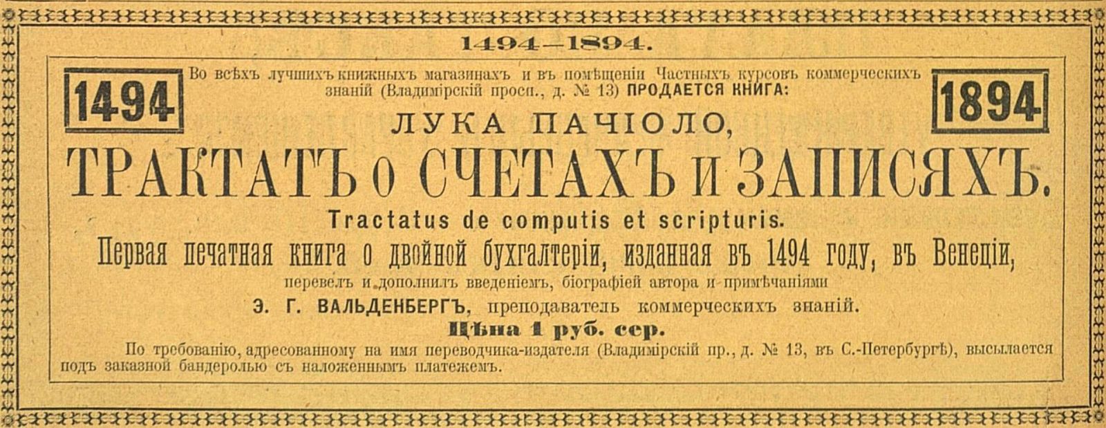 В первой половине XV века в Англии появились понятия, относящиеся к оценке предприятий, в частности, деловая репутация (goodwill). Спустя век вышел в свет «Трактат о счетах и записях» Луки Пачоли, положивший начало современному «двойному итальянскому» бухгалтерскому учету.